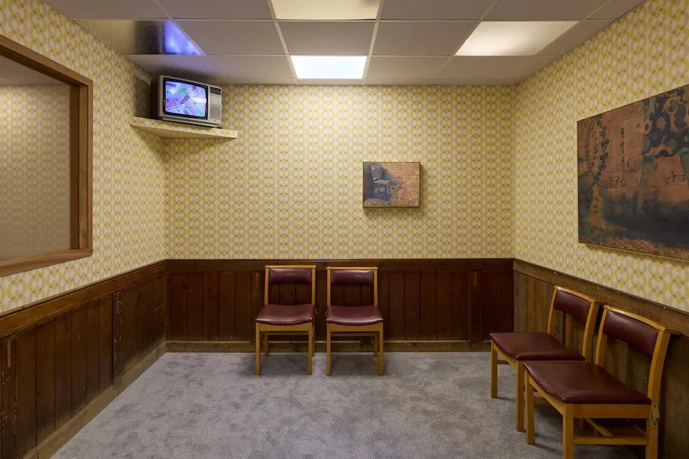 The Perimeter has been transformed across a multitude of time periods, each room unfolding as fragments of a cyclical narrative. Situated during the collapse of Victorian domesticity, these sites intersect with mid-20th century countercultural movements and contemporary visual signifiers. Layers of wallpaper and archival clippings are embedded as a patina in Metcalf’s set dressings. By incorporating historical and material references, she depicts England’s legacy of psychiatric spaces and public crises of care. These built interiors offer a segmented view inside a clinical enclosure; made up of waiting rooms, abandoned surgical theatres, and damp vinyl floors. In these works, she blurs the line between domestic and institutional interiors, obscuring the boundary between care and confinement.