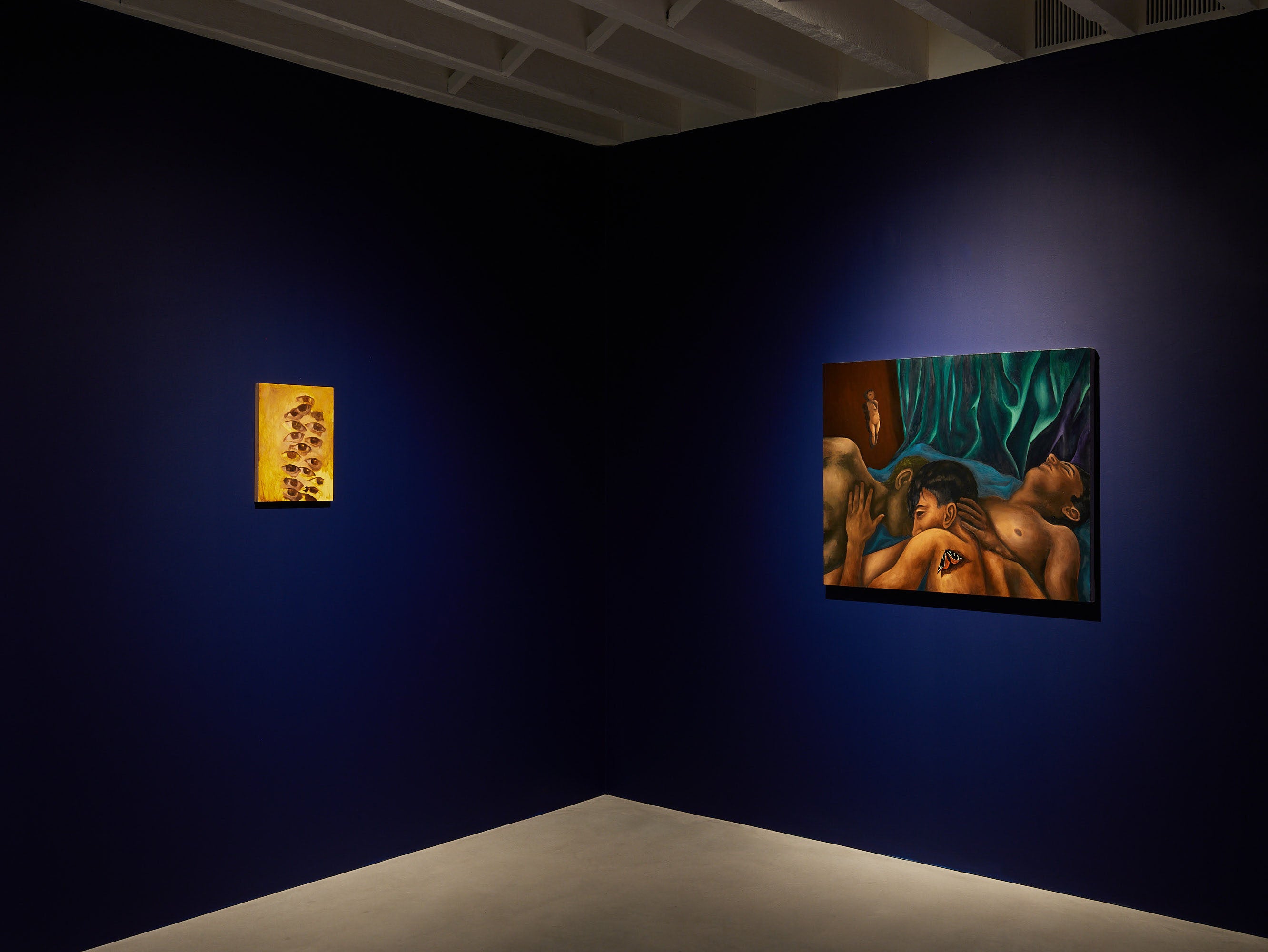 Often fantastical, though always anchored in the present, Hammond’s work recalls fleeting memories and dreamlike states, cast through a lens inspired by both the Baroque and Surrealist movements. They interweave scenes of myth alongside reality, often depicting half-human creatures inhabiting dark architectural worlds. The paintings are visual explorations of the body’s interpersonal and individual relationships and operate a deeply enrapturing sense of otherness, navigating the fine line between existential dread and human comfort. Hammond’s practice explores themes of stasis, interiority, and contemplation. With a central focus on corporeality and underscored by a tangible sense of the uncanny, his figurative paintings capture a moment frozen in time.